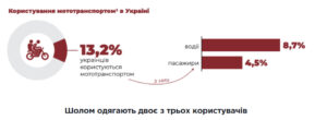 За результатами опитування, 13,2% дорослого населення користуються мототранспортом: 8,7% — як водії, 4,5% — як пасажири. Найактивніше мотоцикли, мопеди та скутери використовує молодь 18–29 років (28,4%). Серед чоловіків користувачів більше — 17%, серед жінок — 10,1%.