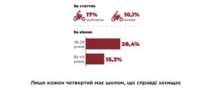 Рівень використання шоломів серед водіїв мотоциклів — 82,6%, тоді як серед водіїв мопедів і скутерів — лише 49,2%.