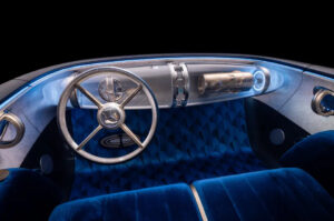 Салон Vision Iconic объединяет классические формы с современными технологиями. Центральная панель под названием “Zeppelin” сочетает аналоговые приборы и цифровые дисплеи. Часы с логотипом Mercedes-Benz выполняют роль интеллектуального голосового ассистента.