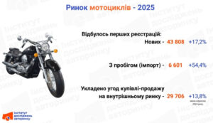 По итогам 2025 года в Украине было зарегистрировано 43 808 новых мотоциклов, что на 17,2% больше, чем годом ранее. Ещё более динамично развивался сегмент импорта подержанной техники — 6 601 первая регистрация, или +54,4% в годовом выражении.